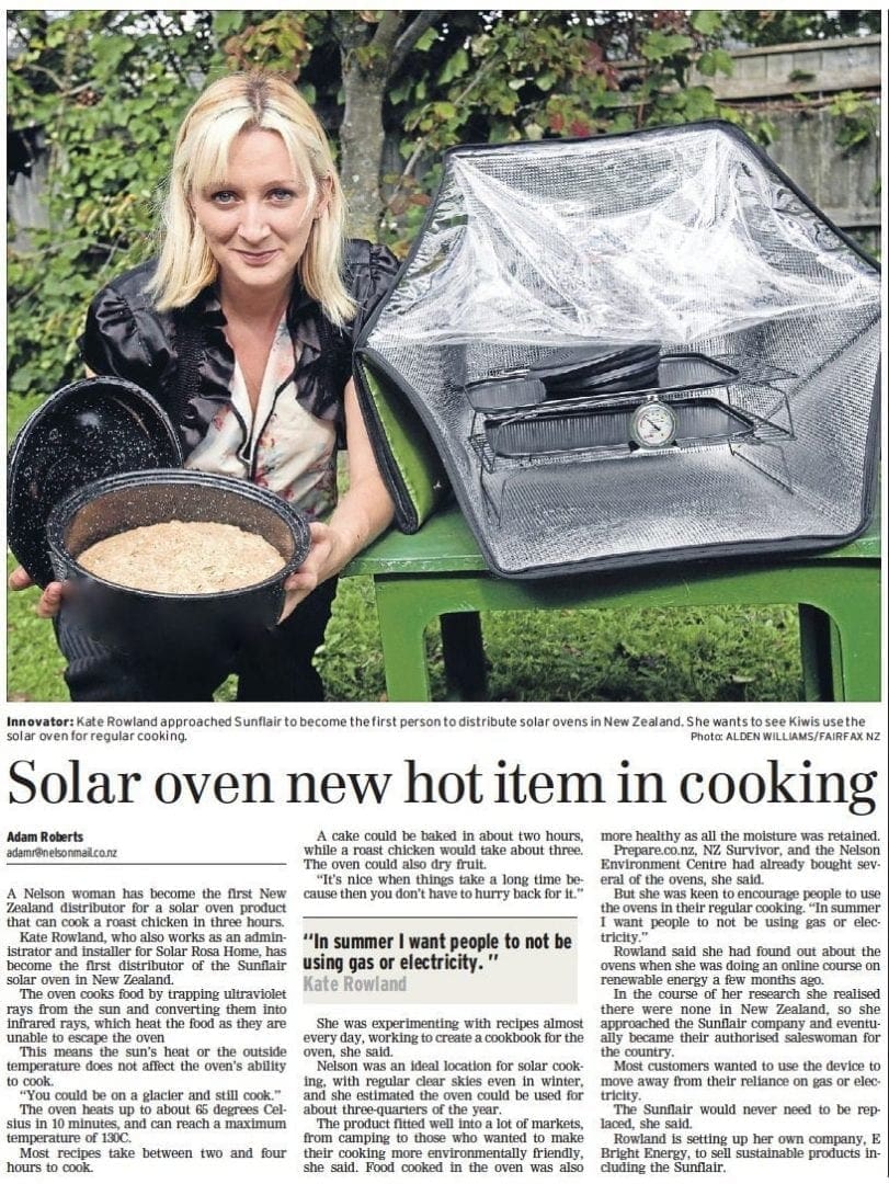 Kate Rowland, who also works as an administrator and installer for Solar Rosa Home, has become the first distributor of the Sunflair solar oven in New Zealand.