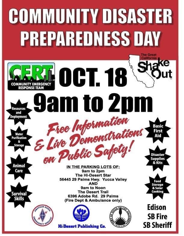 Here’s the official flyer for the October 18 Shakeout event. Melinda Seller of SUNFLAIR will be talking about solar cooking and Mara Cantelo of Tender Loving Christmas will be talking food storage. If you’re in the High Desert area, come by and see us!